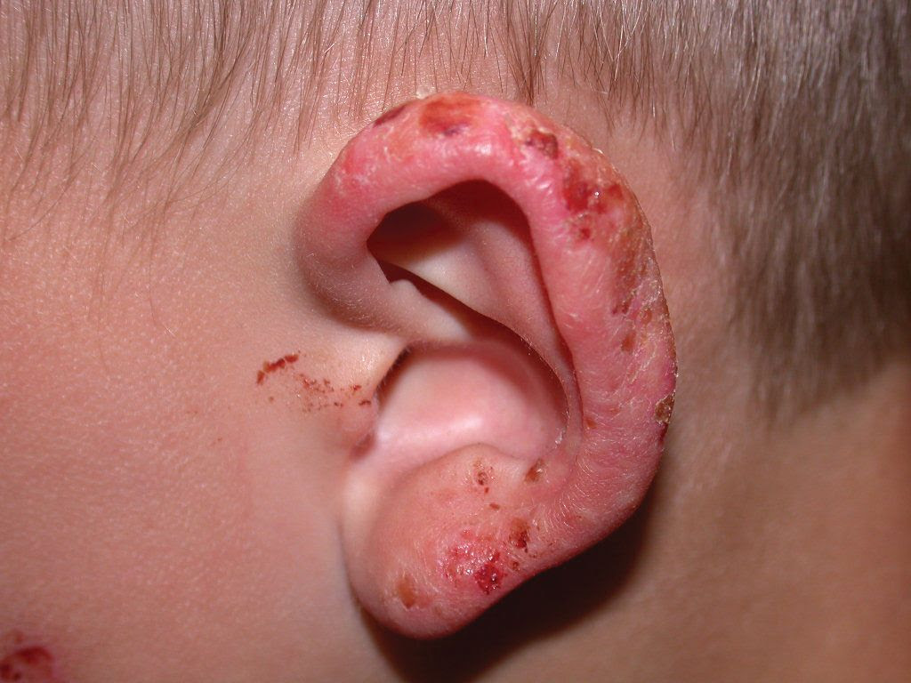 Case: A 5 year-old boy presents with scaly plaques affecting both ears. They are itchy with crusty vesicular lesions. He is not responding to mupirocin. This happened last spring as well.
